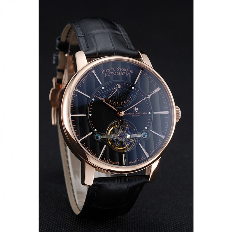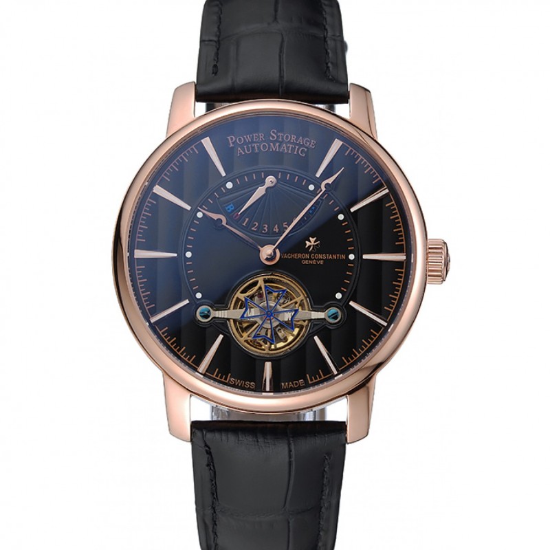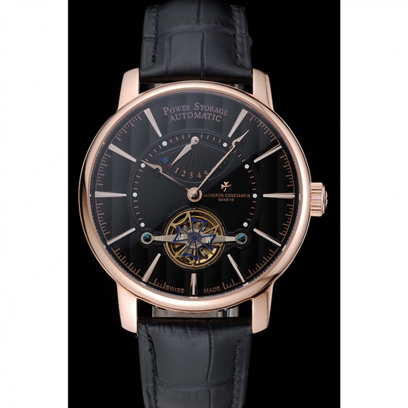 AAA Réplicas Relojes Vacheron Constantin Tourbillon De Reserva Negro Dial Caso Negro Oro Pulsera de cuero 1454271