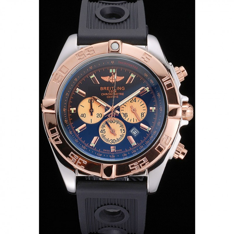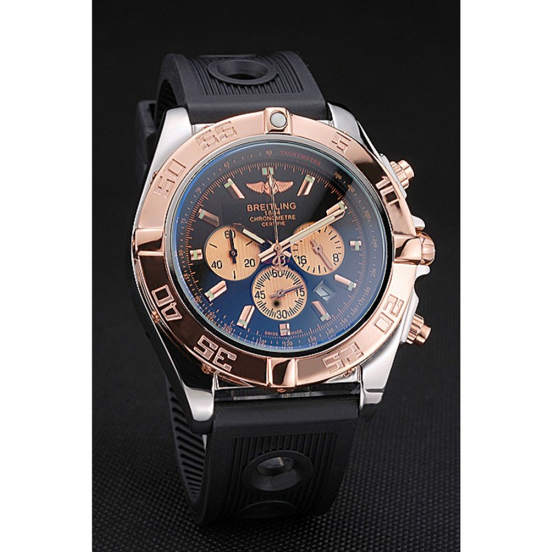 «Replicas de Relojes Baratos: Breitling Dial Negro Bisel De Oro Rosa Y sub-esferas Caso de acero inoxidable correa de caucho Negro»