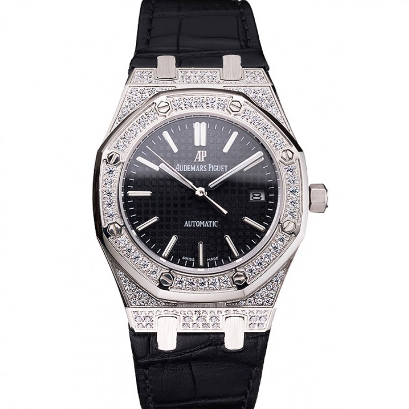 Suiza Audemars Piguet Royal Oak Negro caja de acero con diamantes Dial correa de cuero Negro