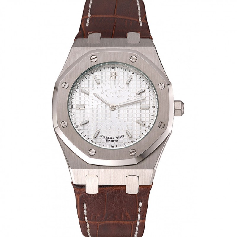 Mejor Réplicas Relojes Audemars Piguet Royal Oak Fondation Blanco Dial correa de cuero caja de acero inoxidable de Brown