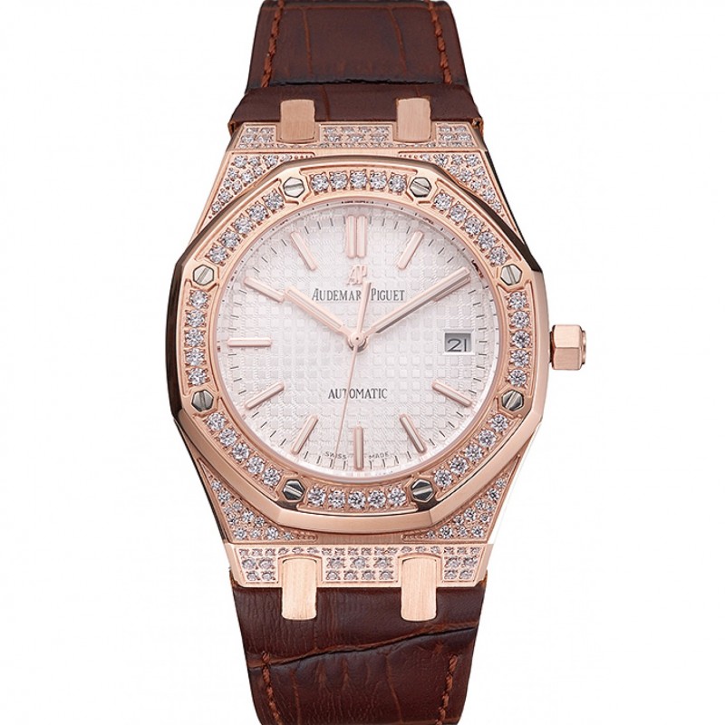 Mejor Réplicas Relojes Suiza Audemars Piguet Royal Oak de oro blanco con diamantes Caso Dial correa de cuero de Brown