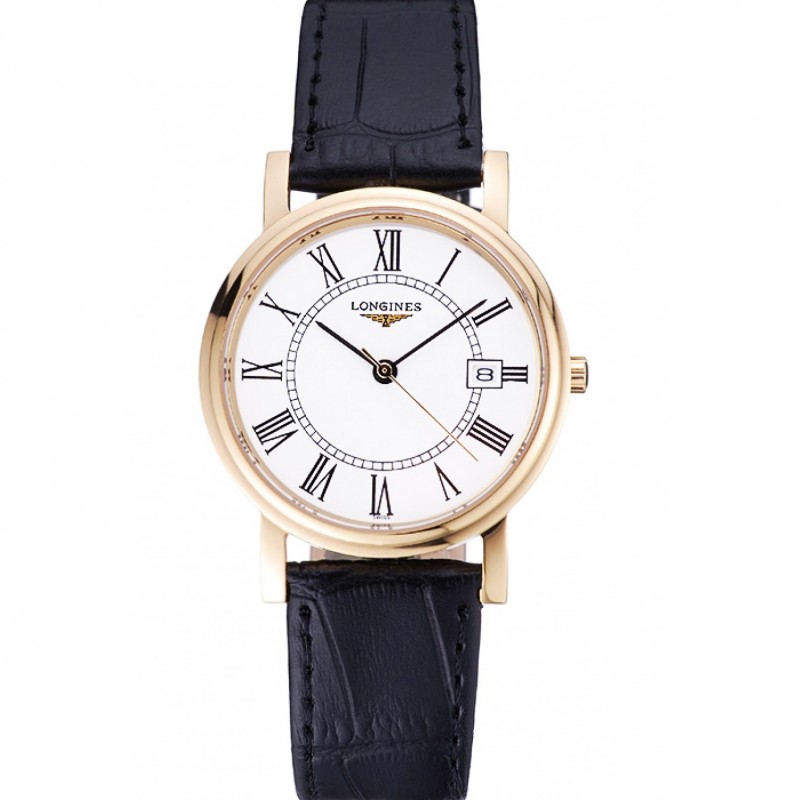 Longines La Grande Classique dial redondo blanco Caso Negro Oro banda de cuero 622382
