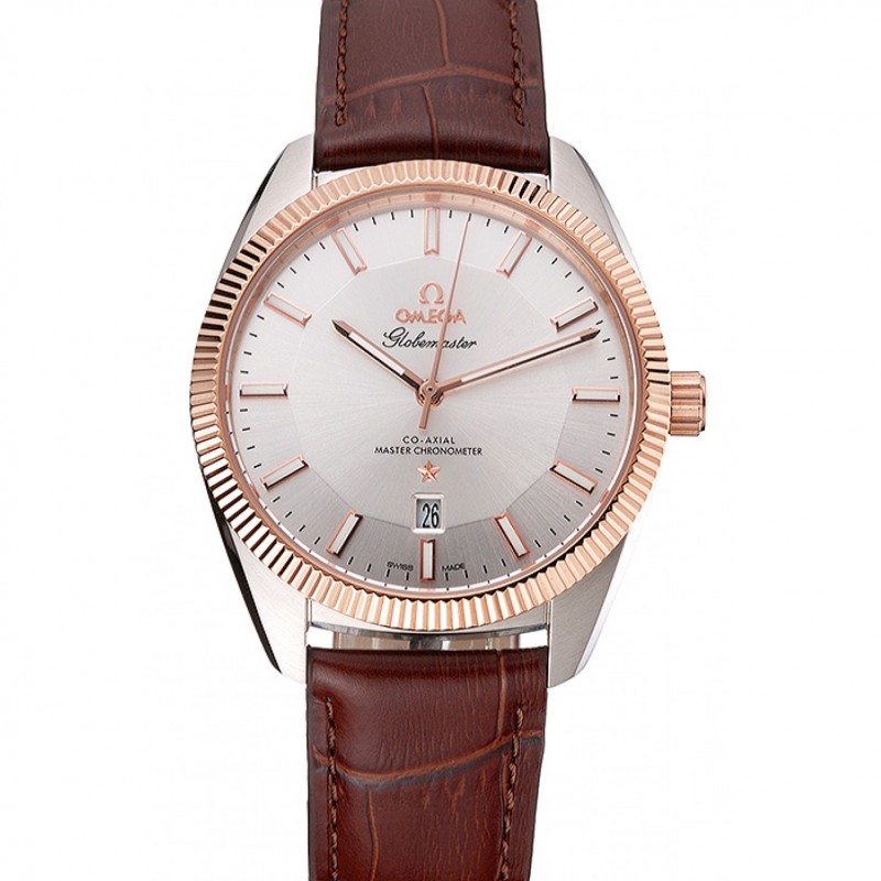 Omega Globemaster Plata Dial correa de cuero del bisel de oro rosa caja de acero inoxidable de Brown