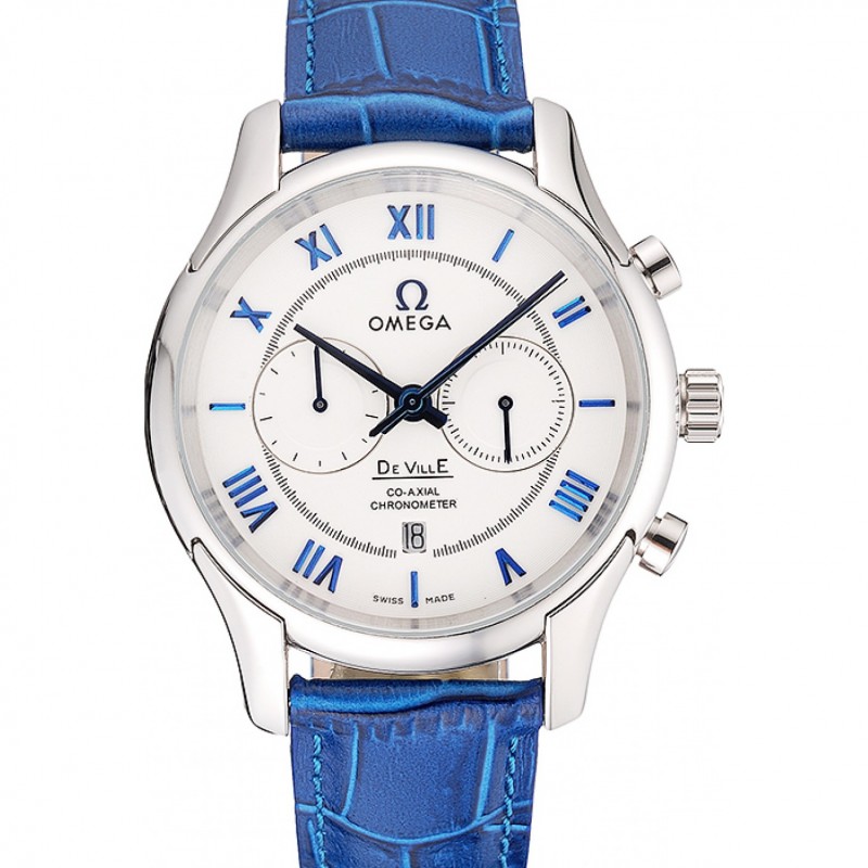 Omega DeVille bisel plateado con esfera blanca y correa de cuero azul 621568