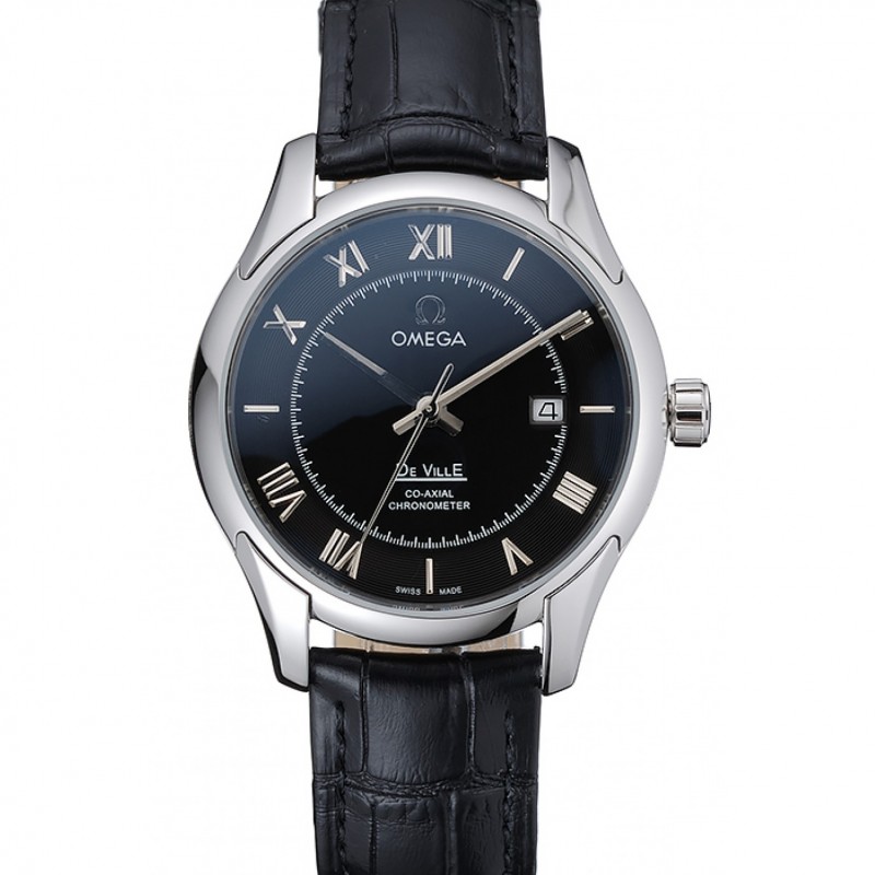 Lujo Réplicas Relojes Correa de cuero Omega DeVille suiza de acero inoxidable Bisel Negro 7620