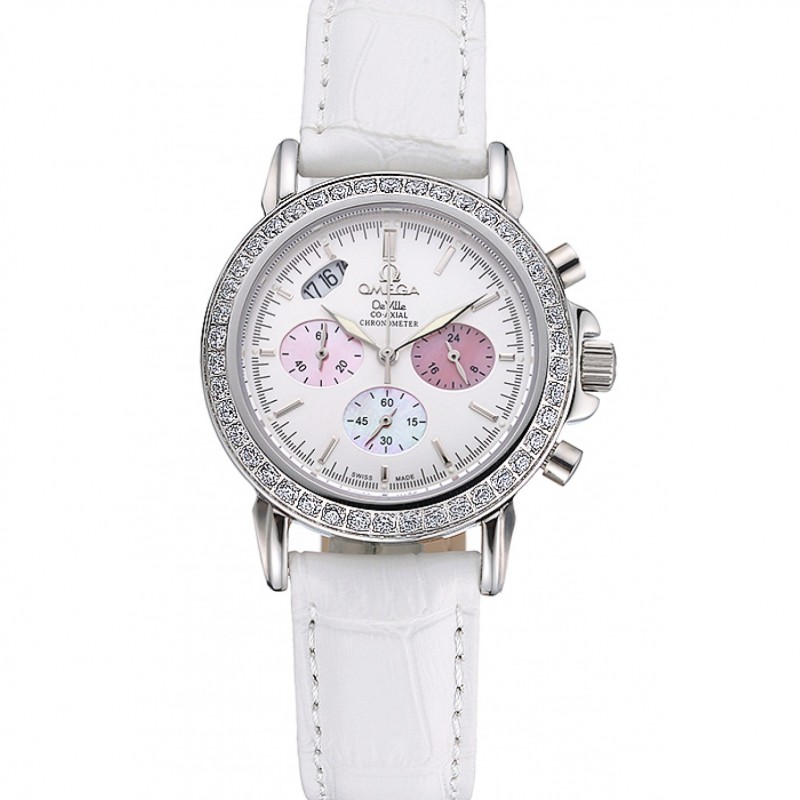 Barato Omega De Ville cronógrafo Esfera Blanca, la caja del diamante del acero inoxidable de la pulsera de cuero blanco 622453
