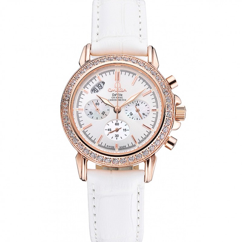 Mejor Omega Speedmaster Cronógrafo esfera blanca caja del diamante de oro pulsera de cuero blanco 622455