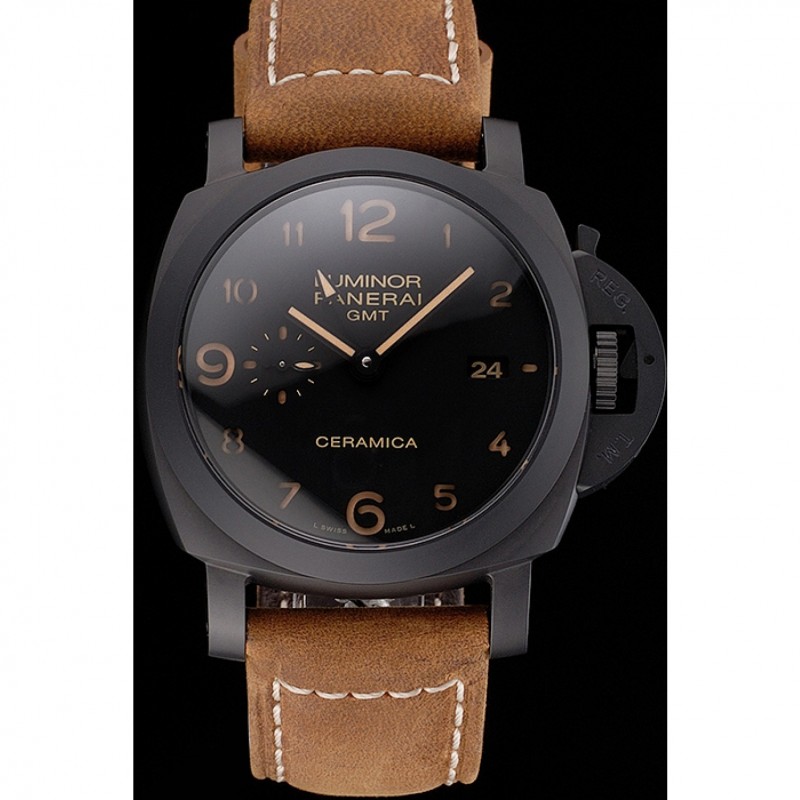 Suiza Panerai Luminor GMT Ceraica Negro Dial correa de cuero de la caja Negro Marrón