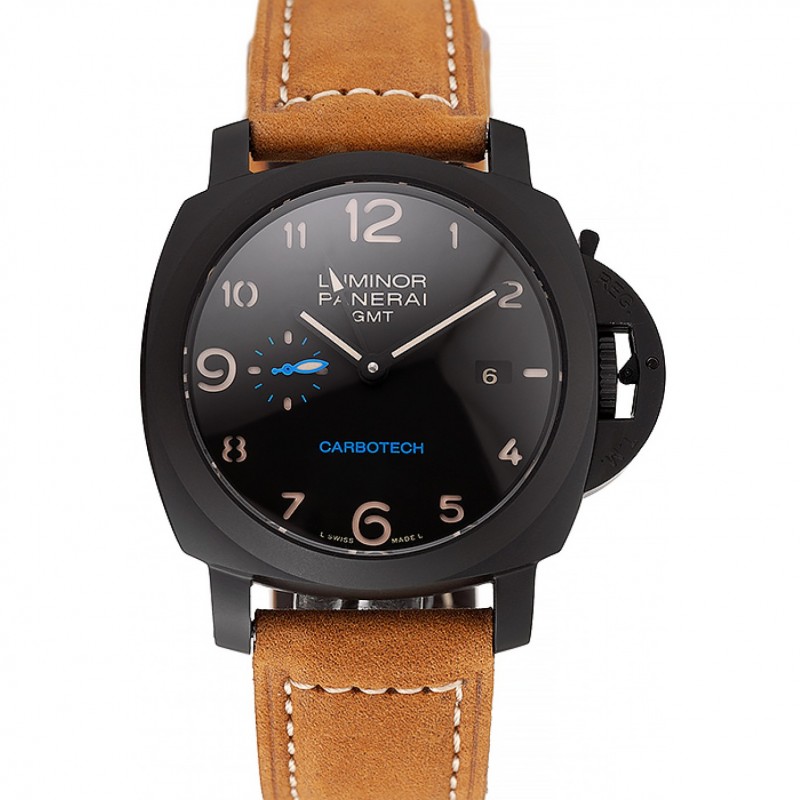Suiza Panerai Luminor GMT Carbotech Negro Dial correa de cuero de la caja Negro Marrón