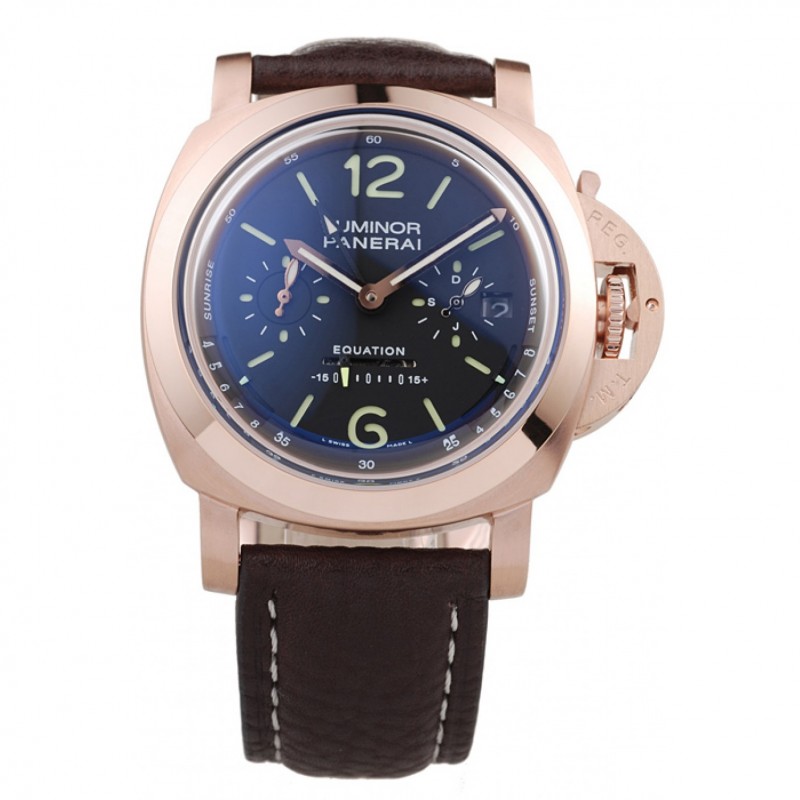 Gama alta Panerai Luminor Caja Oro Rosa Negro Dial correa de cuero marrón oscuro