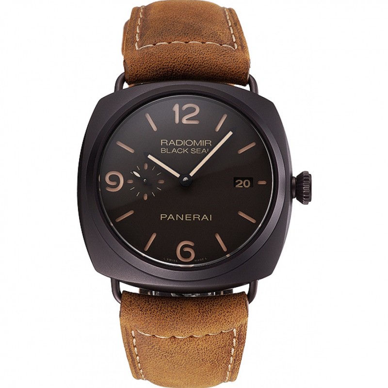 Mejor Réplicas Relojes Suiza Panerai Negro Sello Brown Dial correa de cuero de la caja Negro Marrón