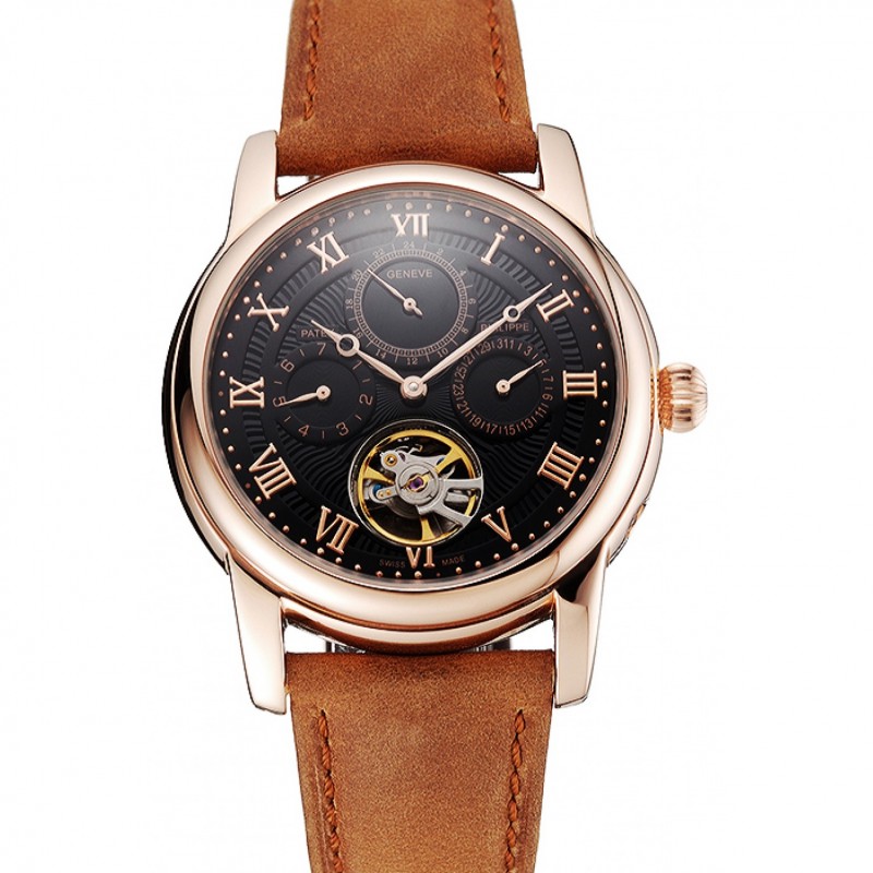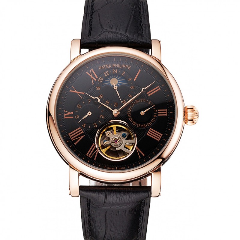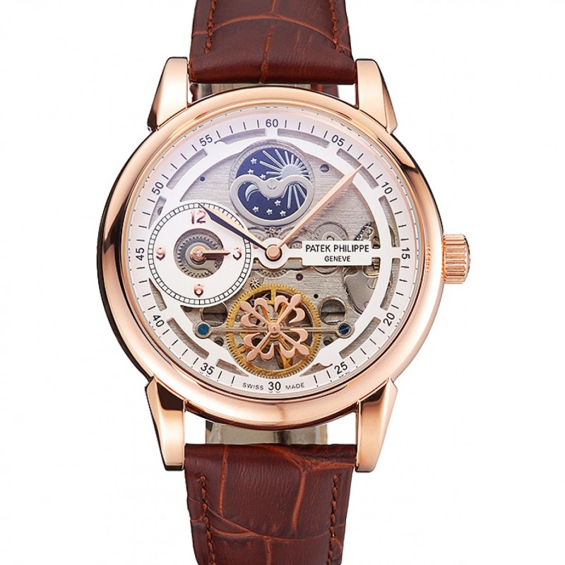 Patek Philippe Tourbillon Tiempo doble Fase lunar negro en esqueleto Dial correa de cuero de la caja de oro rosa Brown