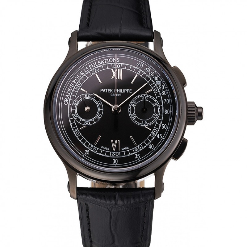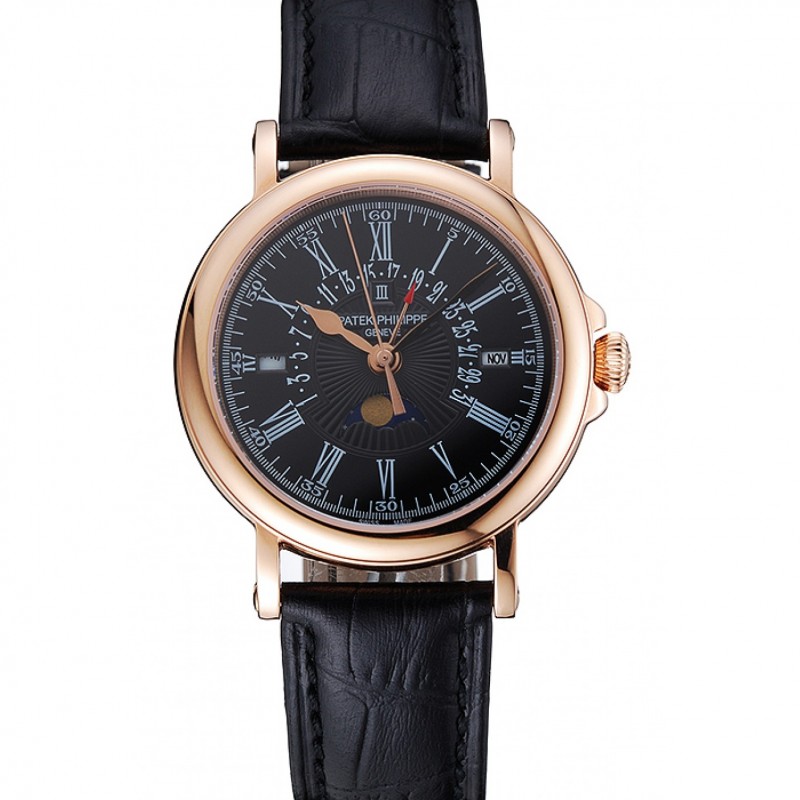 Lujo Patek Philippe Calendario Perpetuo retrógrada Fecha Negro Dial Oro Rosa Caso Negro Pulsera de cuero 1454150