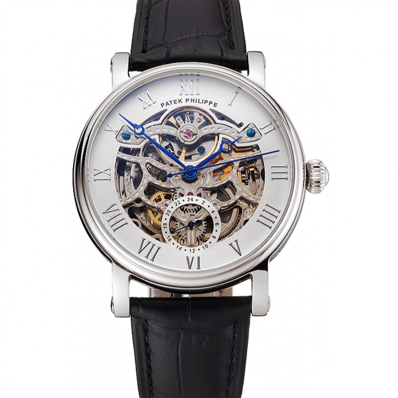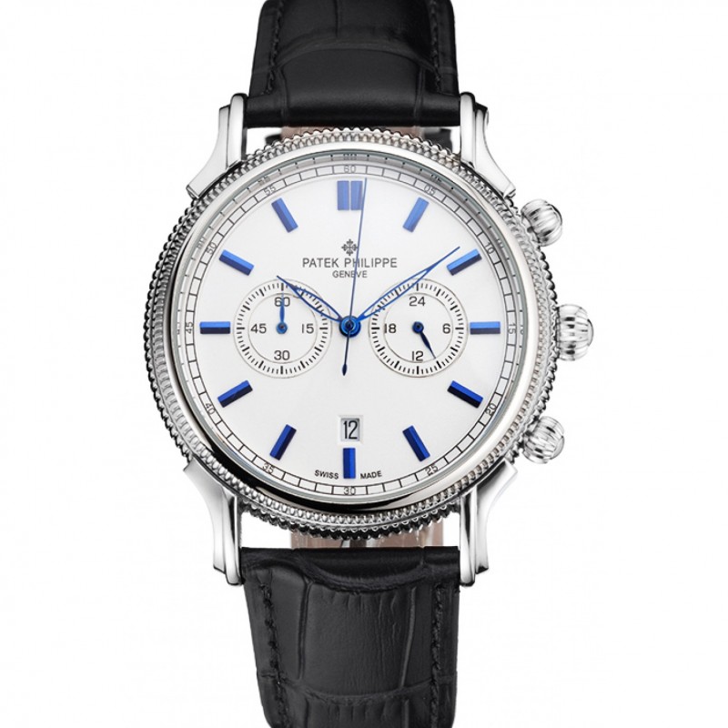 Mejor Patek Philippe cronógrafo Esfera Blanca, Correa de cuero azul Marcas caja de acero inoxidable Negro