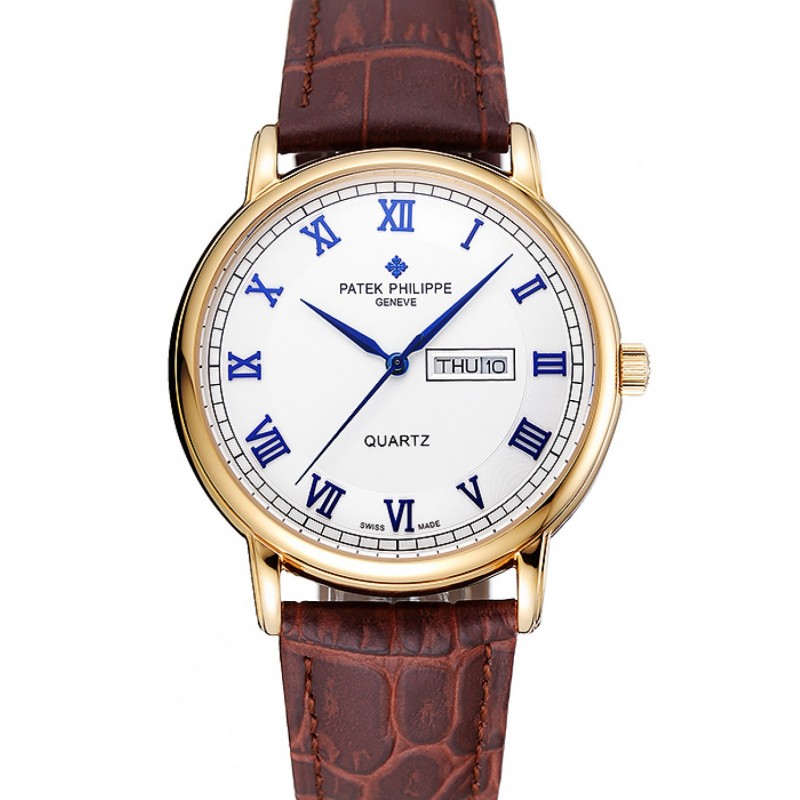 Patek Philippe Esfera Blanca Azul números romanos Caja Oro Brown pulsera de cuero 1454057