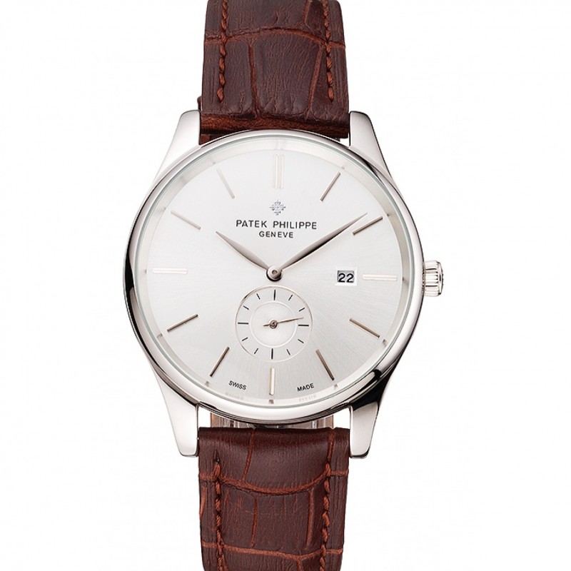 Patek Philippe Fecha de plata Dial correa de cuero caja de acero inoxidable de Brown