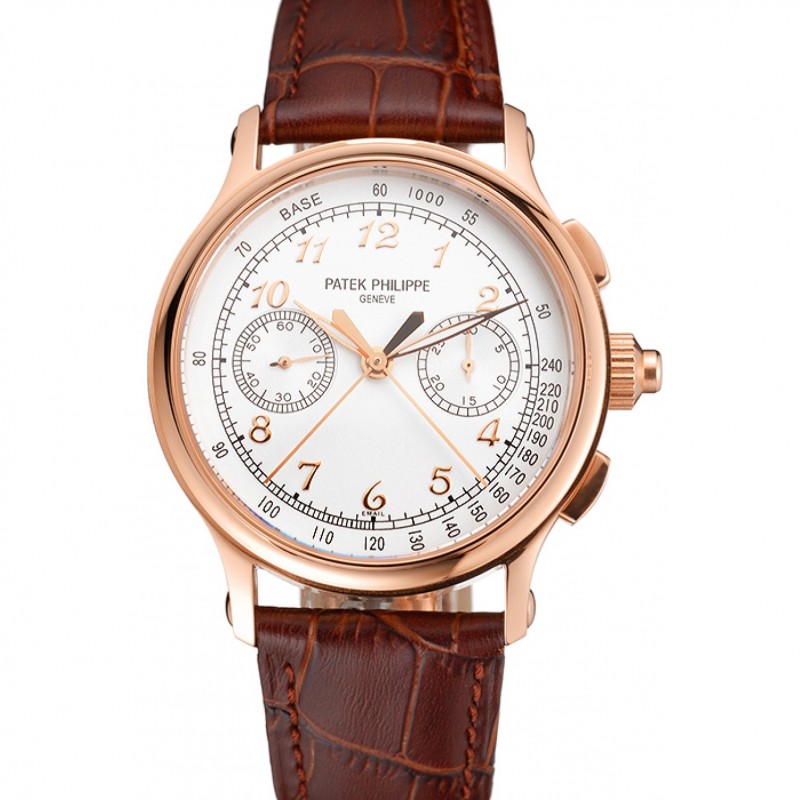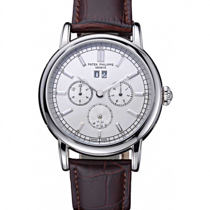 Patek Philippe Geneve Grand complicaciones esfera blanca de acero inoxidable Bisel Brown banda de cuero 622151