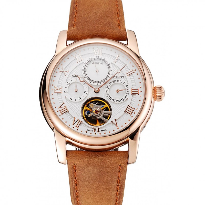 Patek Philippe Grand complicaciones Día Fecha Tourbillon esfera blanca Caja Oro Rosa Gamuza marrón correa de cuero 1453813