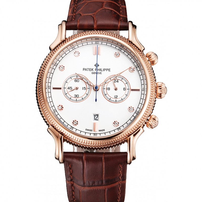Patek Philippe cronógrafo esfera blanca con diamantes correa de cuero de la caja de oro rosa Brown