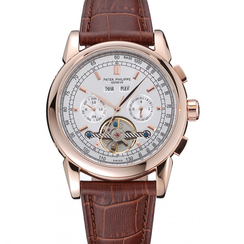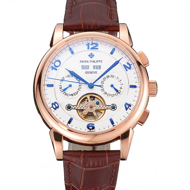 Patek Philippe Calendario Perpetuo Tourbillon esfera blanca correa de cuero de la caja de oro rosa Brown