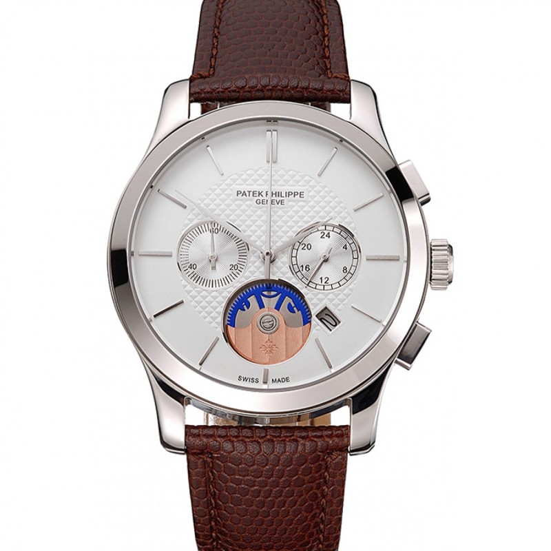 Patek Philippe cronógrafo esfera blanca correa de cuero caja de acero inoxidable de Brown