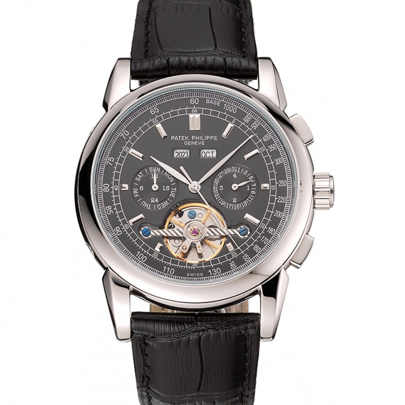 Patek Philippe Calendario Perpetuo Tourbillon Negro Dial correa de cuero caja de acero inoxidable Negro