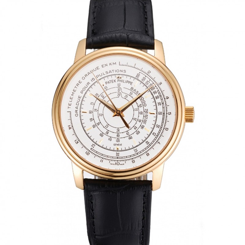 Suizo Patek Philippe Multi-Scale cronógrafo Esfera Blanca, Correa De Cuero Caso Negro Oro