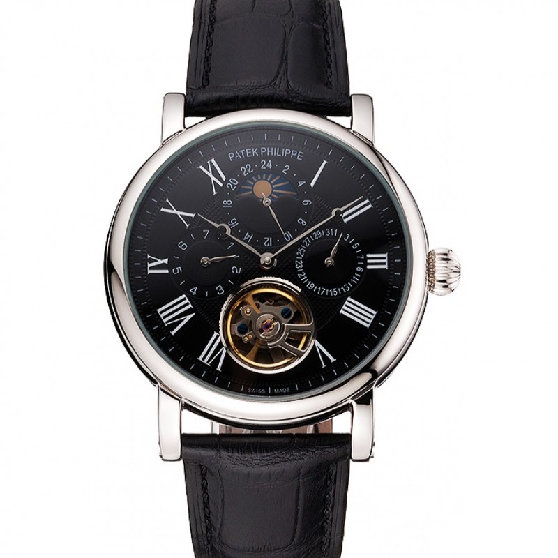 Las complicaciones Fase lunar Patek Philippe Tourbillon Negro Dial correa de cuero caja de acero inoxidable Negro