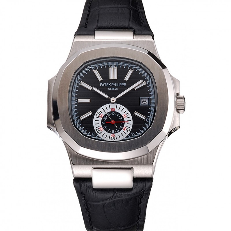 Barato Patek Philippe Nautilus Negro Dial correa de cuero caja de acero inoxidable Negro