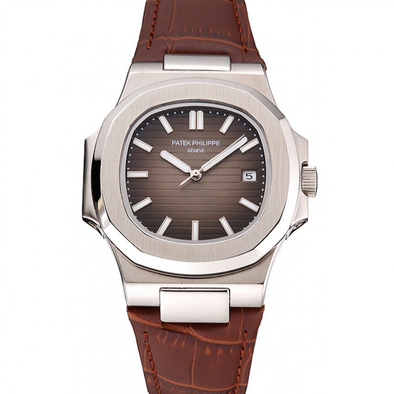 Patek Philippe Nautilus Gris Dial correa de cuero caja de acero inoxidable de Brown