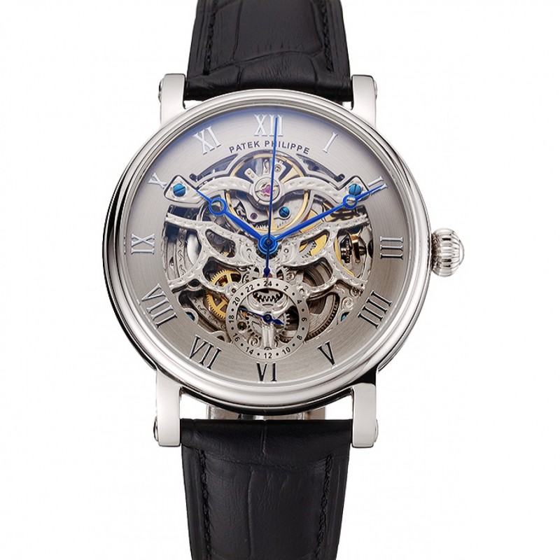 Patek Philippe Grand complicaciones gris Esqueleto Dial caja de acero inoxidable Negro correa de cuero 1453811