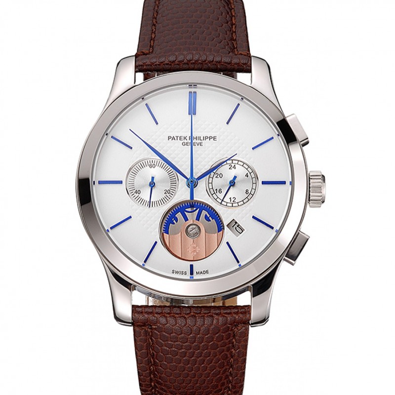 Patek Philippe cronógrafo Esfera Blanca, Correa de cuero azul Manos caja de acero inoxidable de Brown