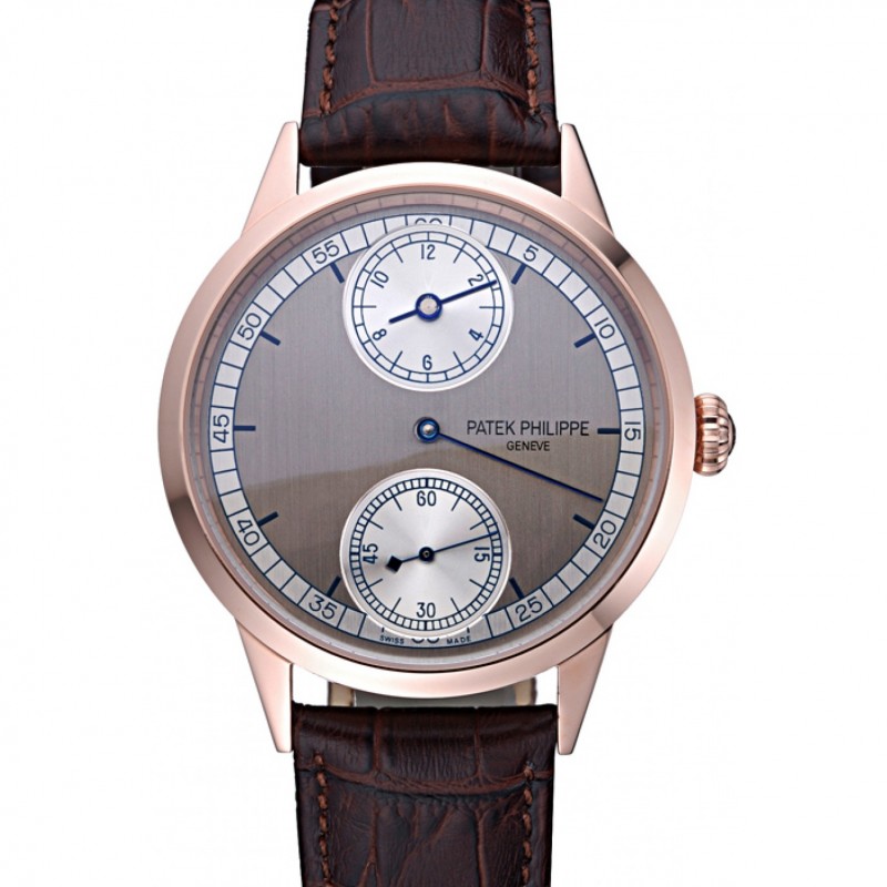 Patek Philippe Geneve Dos Dial Gris Dial de oro rosa Bisel Brown banda de cuero 622148