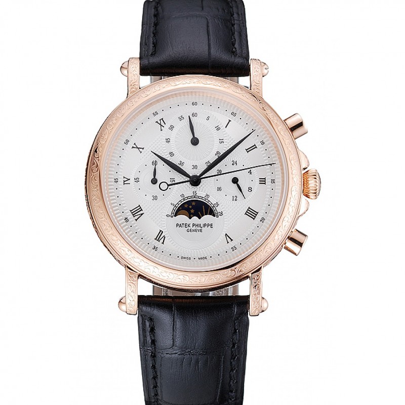Patek Philippe Grand complicaciones Esfera Blanca, grabado Caja Oro Rosa Negro Pulsera de cuero 1454144