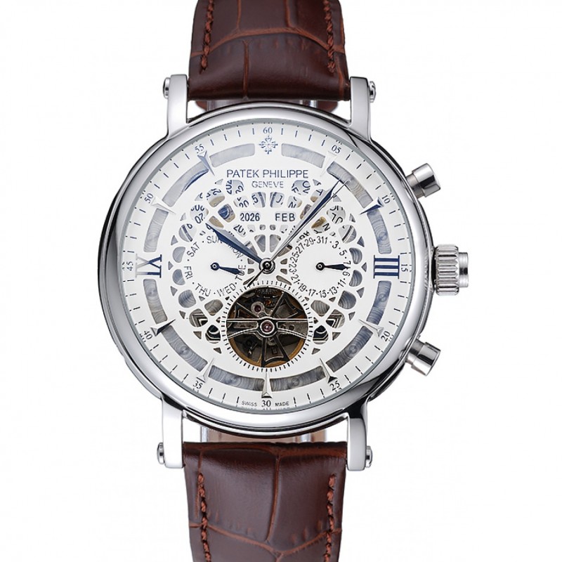 Patek Philippe Grand complicaciones Calendario Anual Blanco Dial de plata del caso Brown pulsera de cuero 1454233
