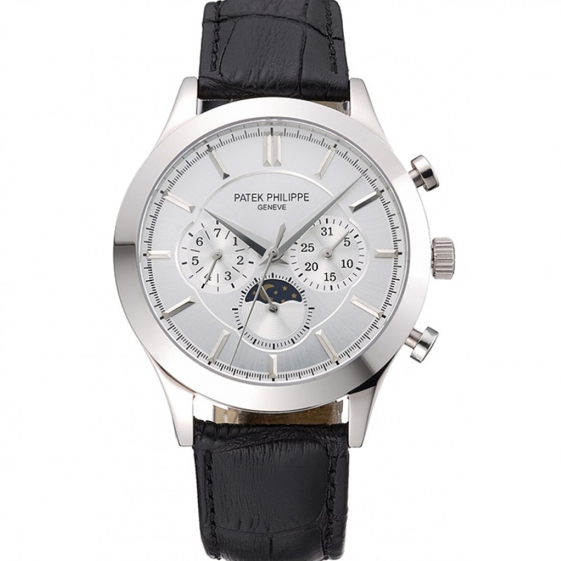 Patek Philippe Fase lunar Cronógrafo Esfera Blanca Caja de acero inoxidable Correa de Cuero Negro 622841