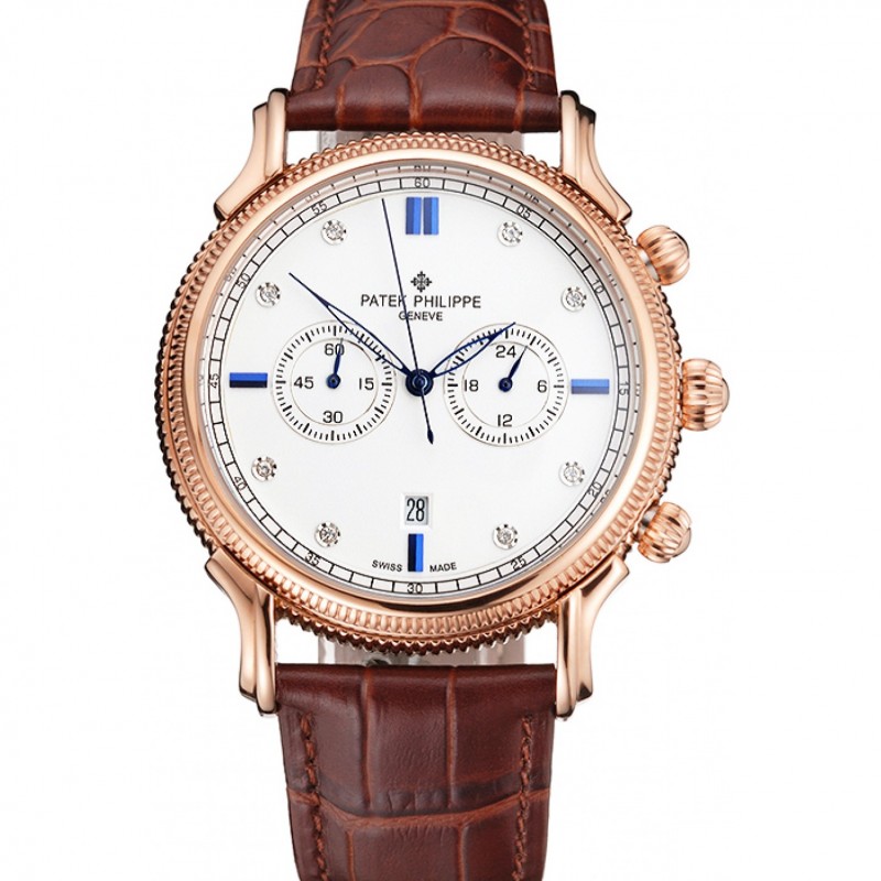Patek Philippe cronógrafo esfera blanca con azul y correa de cuero del diamante Marcas Caja Oro Rosa Brown
