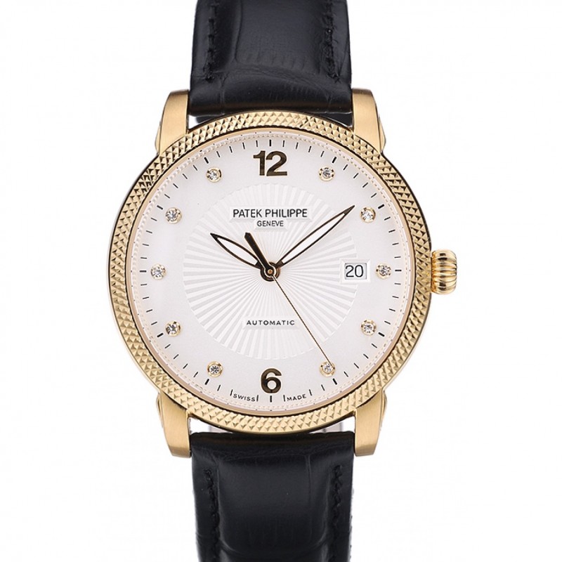Patek Philippe Calatrava suizo Bisel acanalado esfera blanca correa de cuero Negro 7642
