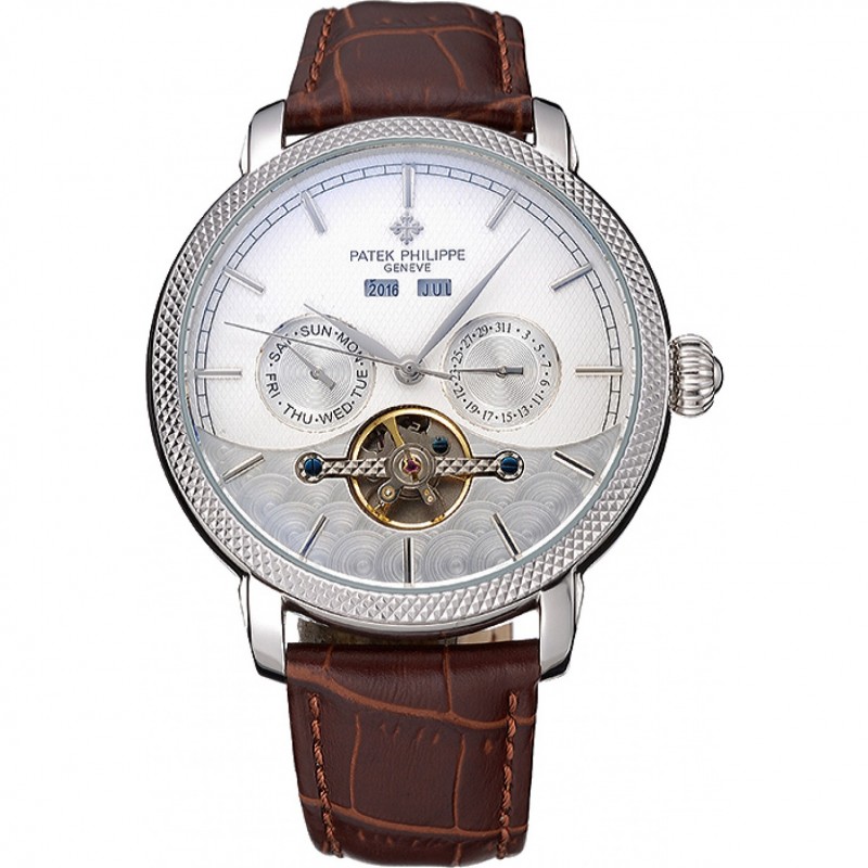 Patek Philippe Tourbillon Día Fecha esfera blanca caja de acero inoxidable en relieve Bisel Brown correa de cuero 622837