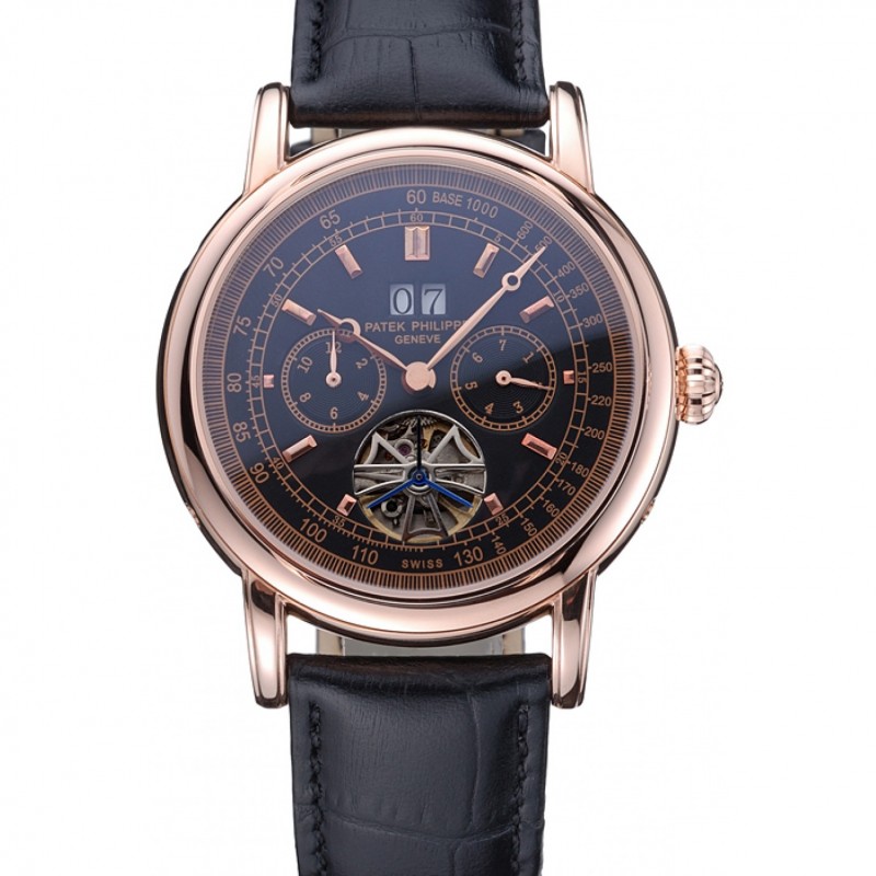 Lujo Réplicas Relojes Patek Philippe Geneve Grand complicaciones Tourbillon Dial Negro Bisel De Oro Rosa Negro Band 622157