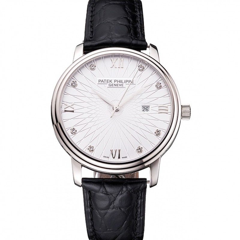AAA Réplicas Relojes Patek Philippe Fecha grabada en relieve blanco Dial correa de cuero caja de acero inoxidable Negro
