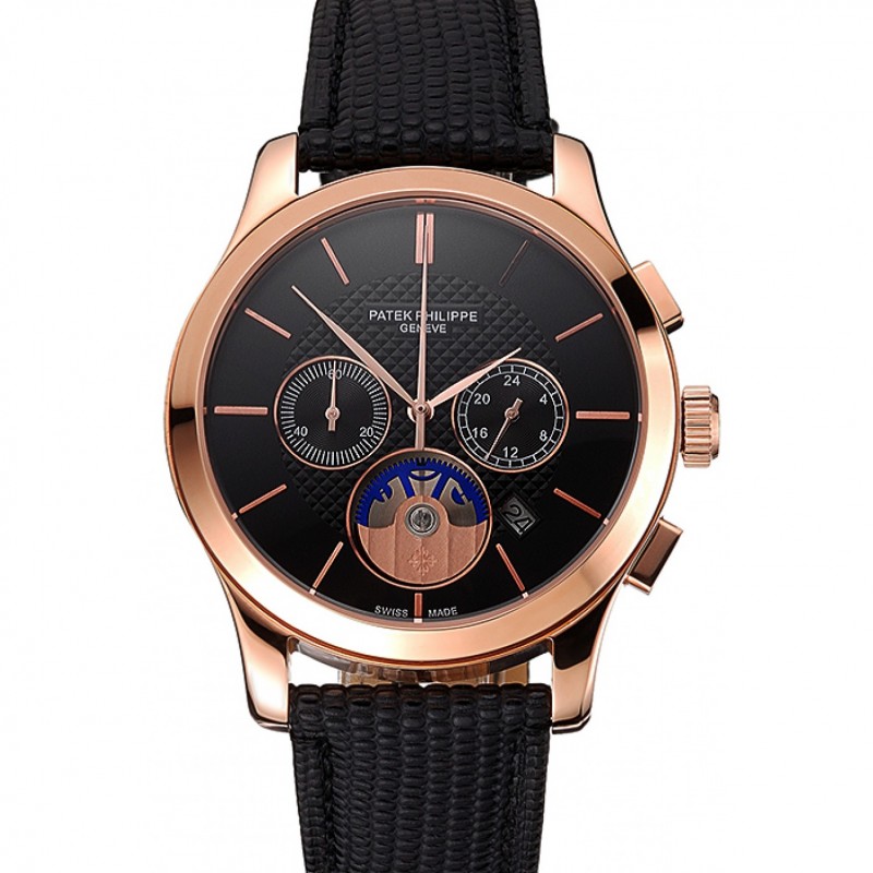 Patek Philippe Cronógrafo Negro Dial correa de cuero de la caja de oro rosa Negro