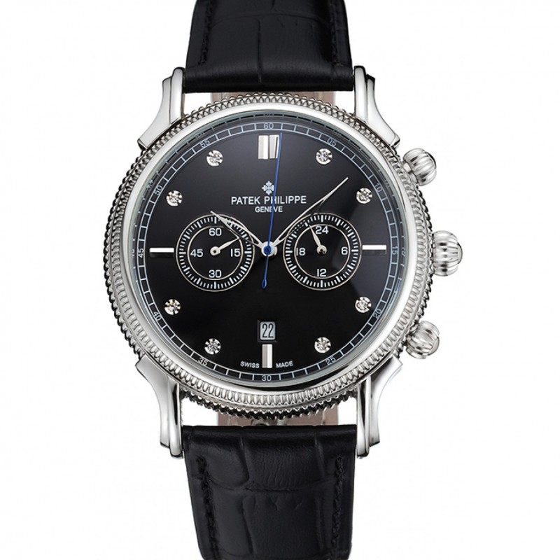 Patek Philippe Cronógrafo Negro Dial correa de cuero con diamantes caja de acero inoxidable Negro