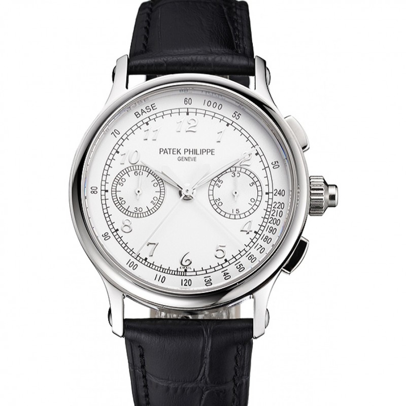 Lujo Segundos suizo Patek Philippe cronógrafo Dividir Blanco Dial correa de cuero de plata numerales caja de acero inoxidable Negro