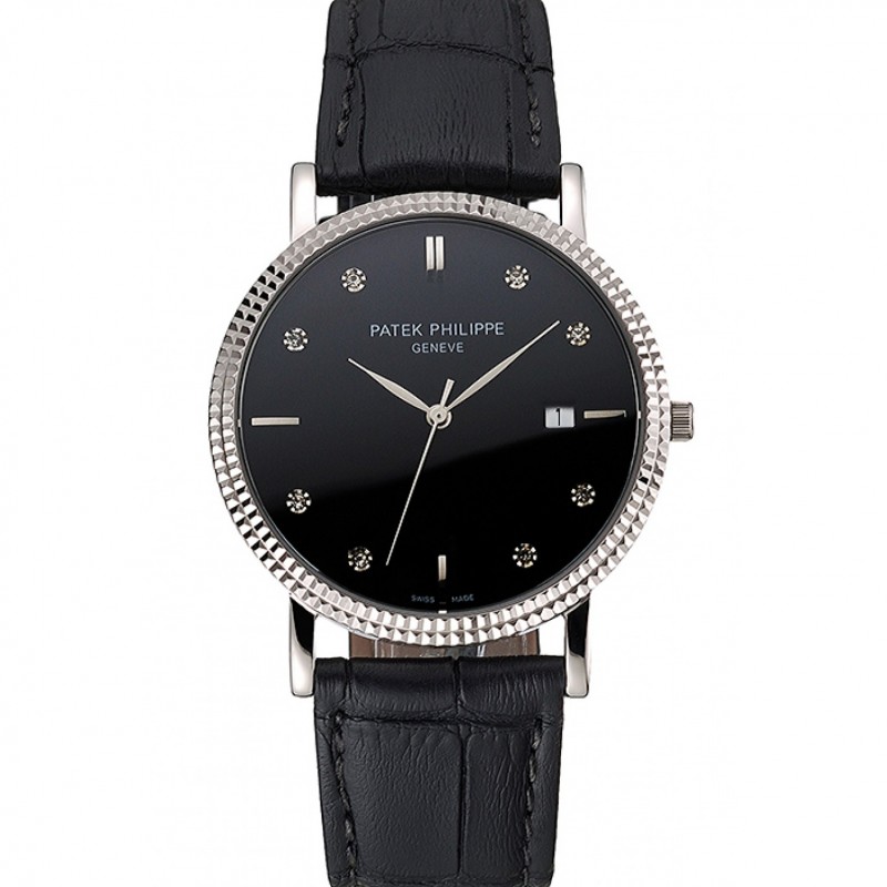 Patek Philippe Negro Dial correa de cuero del diamante marcas de la hora acanalado Bisel caja de acero inoxidable Negro