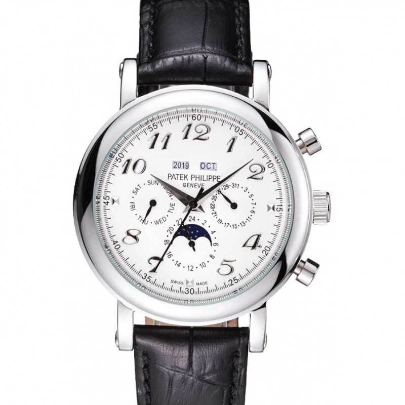Patek Philippe Grand complicaciones Fase lunar línea blanca en la pulsera de cuero Negro