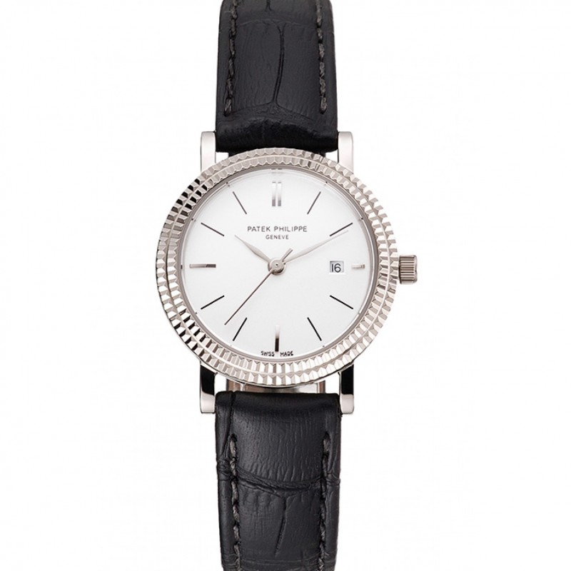 Patek Philippe Blanco Dial correa de cuero de doble bisel acanalado caja de acero inoxidable Negro