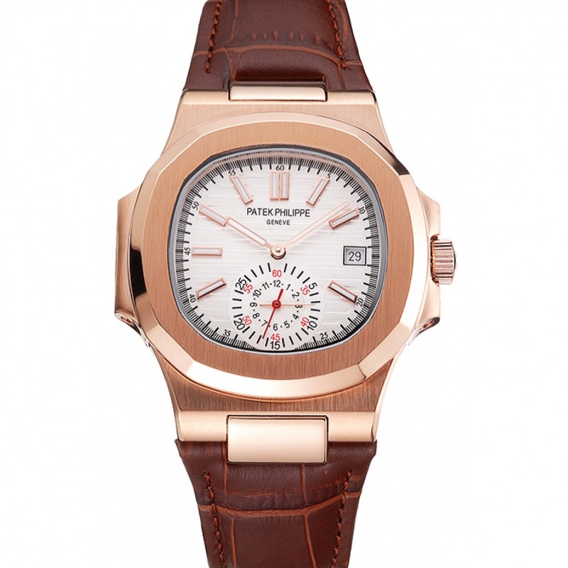 Barato Patek Philippe Nautilus Blanco Dial correa de cuero de la caja de oro rosa Brown