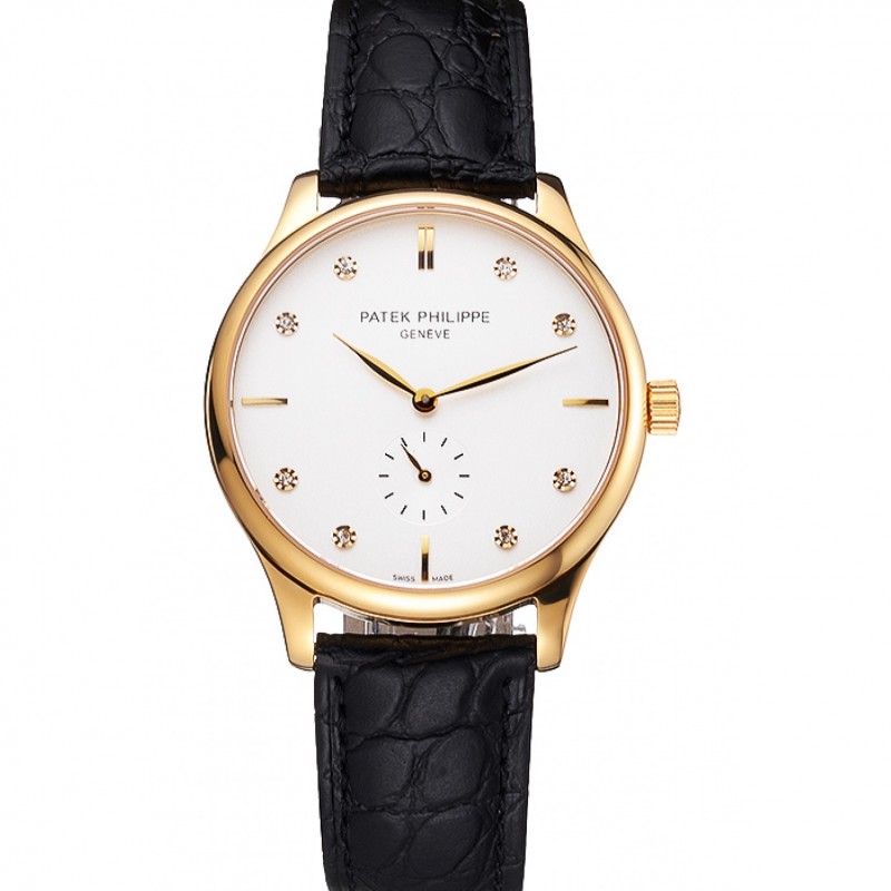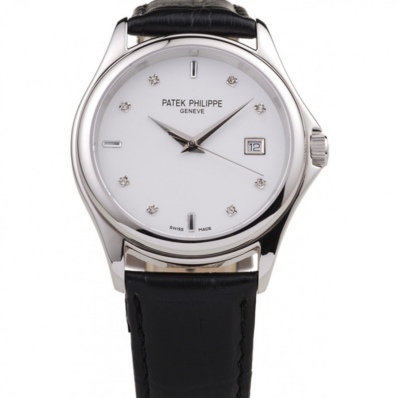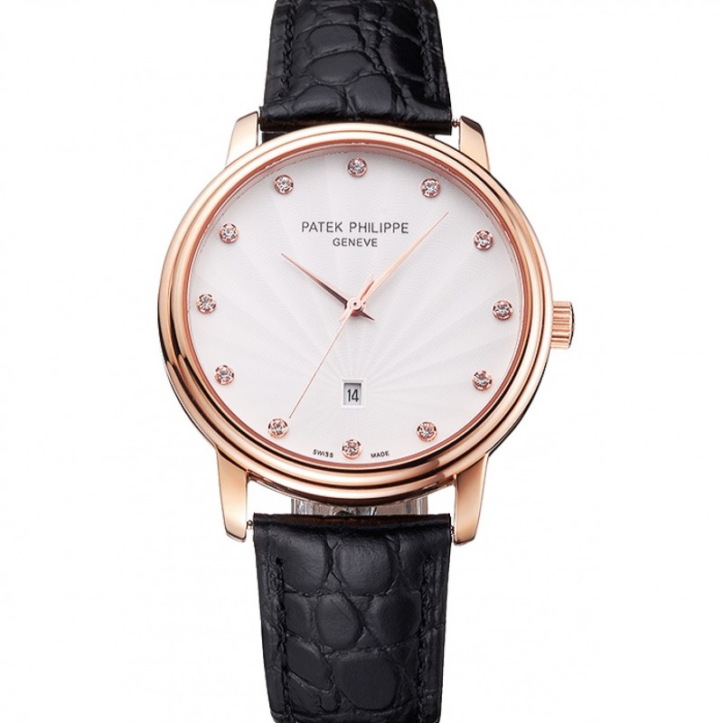 Barato Réplicas Relojes Patek Philippe Geneve Calatrava tachonado cristal horas Marcador Blanco Dial correa de cuero Negro