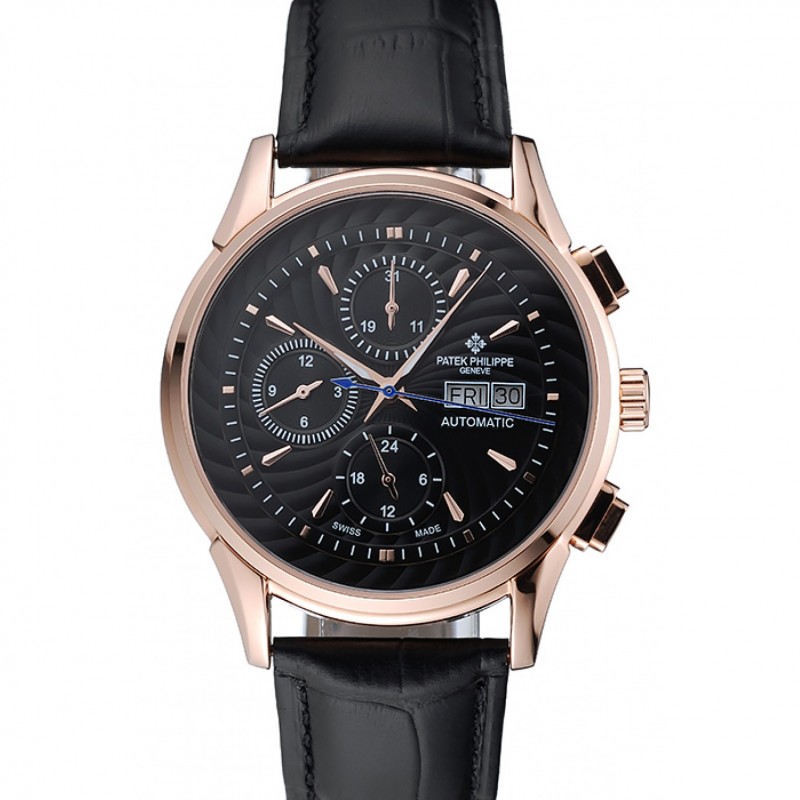 Gama alta Patek Philippe Fecha esfera blanca correa de cuero de la caja de oro rosa Negro